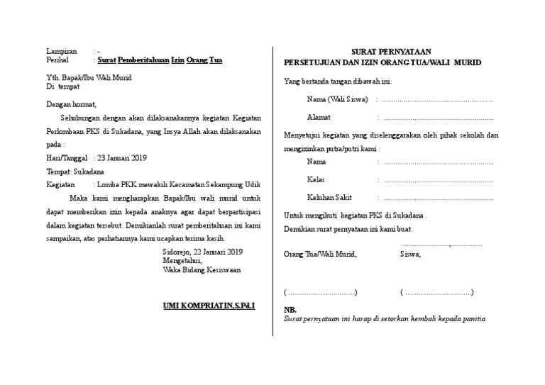 Doc contoh undangan rapat orang tua yaya deui academia edu. Walaupun sudah tersedia berbagai komunikasi canggih dan modern sekarang menulis surat izin dari orang tua tidaklah begitu susah dan mungkin sudah merupakan hal yang biasa bagi sebagian orang. Orang tua pun bisa membuat surat pernyataan untuk menerangkan bahwa anaknya memang sakit dan meminta izin kepada pihak sekolah. Use the download button below or simple online reader. Ijin orang tua untuk penempatan kerja anak. Surat ijin dari orang tua/wali. We are a sharing community. Islam demikian surat izin ini kami buat untuk dipergunakan sebagaimana mestinya. Namun surat ini hanya digunakan/dibutuhkan jika orang tua pelajar/mahasiswa tersebut tidak memiliki slip gaji. Surat pernyataan persetujuan orang tua untuk pendaftaran sekolah. Contoh surat ijin orang tua wali murid anak tidak bisa. Surat ijin orang tua/suami/istri adalah surat yang digunakan/dikeluarkan untuk melengkapi persyaratan melamar pekerjaan baik di dalam negeri maupun di luar negeri, surat ijin orang tua apabila yang bersangkutan belum berkeluarga. Sehubungan dengan hal tersebut di atas, maka dengan ini kami mohon ijin untuk melaksanakan kegiata tersebut.